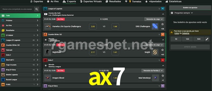 O ax7 oferece uma grande seleção de opções de apostas em e-sports com probabilidades competitivas